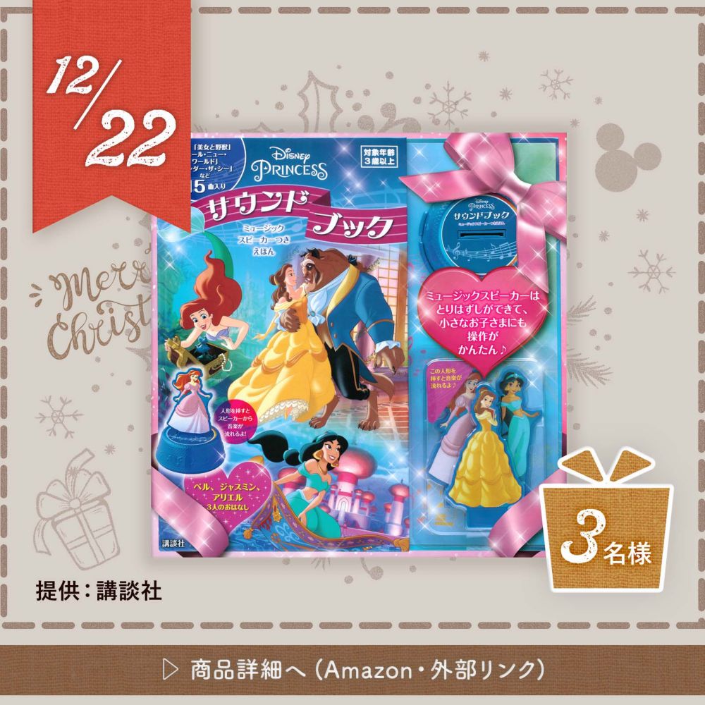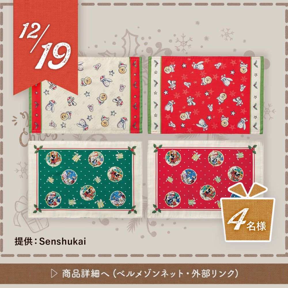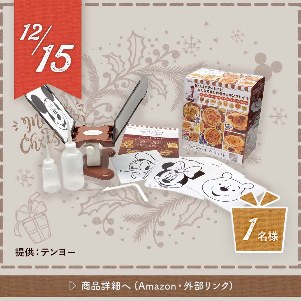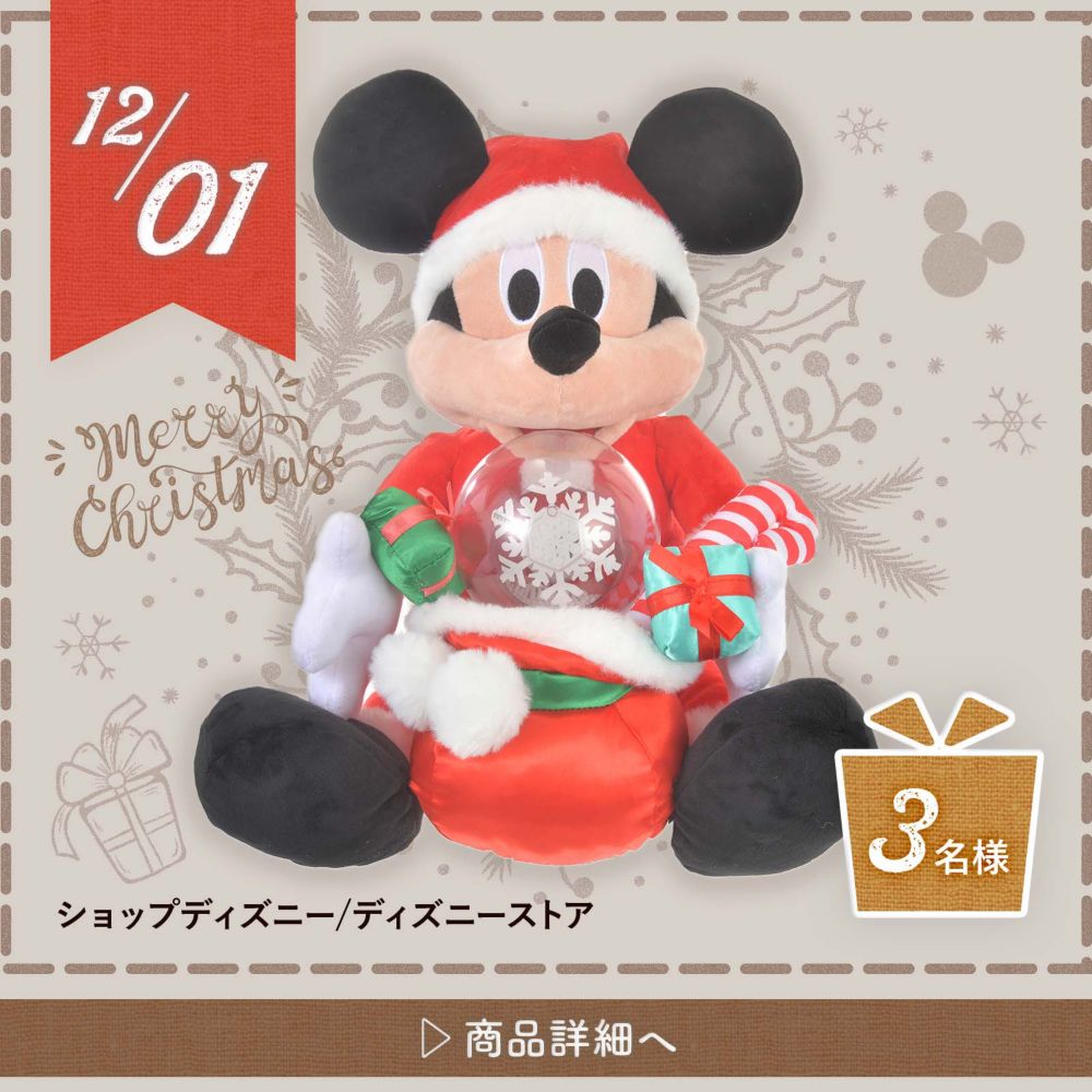 【応募について】 毎日ディズニーグッズが当たる!ワンダフル グッズ キャンペーン 応募期間:2021年12月1日(水)10時00分~2021年12月25日(土)23時59分 日本時間2021年12月25日(土)23時59分59秒までに、本ページ上の応募規約にご同意の上、以下いずれかの方法でご応募ください。 ●応募方法1 ステップ1 ショップディズニー公式Twitterアカウント(@shopDisneyjp)をフォローする。 ステップ2 ショップディズニー公式Twitterアカウントから12月1日から12月25日の期間、各日午前10時に投稿される、次のハッシュタグ<#ワンダルフグッズキャンペーン><#ディズニーワンダフルクリスマス>が含まれるツイートをリツイート。 ※賞品は期間中毎日変わります。ご希望の賞品が掲載されたツイートをリツイートいただくことで賞品をお選びいただけます。 ●応募方法2 本キャンペーン専用応募フォームから応募 ※応募フォームからのご応募の場合、賞品をお選びいただくことはできません。 上記いずれかの方法で応募いただいた方の中から抽選で合計54名様にディズニーグッズをプレゼントします。 ※抽選は2021年12月25日~29日頃に行います。 ※Twitterでご応募の場合 ・13歳未満の方はご応募いただけません(なお、応募又は当選後に13歳未満であることが判明した場合には、当該応募又は当選を無効とさせていただきます。) ・20歳未満の方は保護者の同意を得てからご応募ください。20歳未満の方が仮当選された場合、仮当選者ご本人ではなく、仮当選者の保護者の方による、保護者の方名義のディズニーアカウントへのご登録又はログインにより、当選確定とさせていただく場合があります。 ・20歳未満の方が当選された場合、賞品送付先の確認のために、保護者の方へご連絡させていただく場合がありますので、予めご了承ください。 ・ご応募にはTwitterのログインが必要となります。Twitterが提供するサービスのメンテナンスや不具合が発生し、応募が行えない場合、弊社は責任を負いかねます。 ・ご応募の際のTwitterへのアカウント登録・投稿に関しては、Twitterの利用規約及びプライバシーポリシーが適用されますので、ご確認の上、登録・投稿して下さい。Twitterの利用規約又はプライバシーポリシーに反する登録・投稿について、弊社は責任を負いかねます。 ・ご応募の際の投稿の内容については、第三者のプライバシーや肖像に対する権利、著作権、その他一切の財産的権利を侵害するものではないこと、第三者を誹謗中傷するものではないこと、Twitterの定める規約又はその他法令もしくは公序良俗に反するものではないことを予めご確認いただいた上でご応募いただくものとします。また、ご自身のTwitterアカウントに、ハッシュタグ<#ワンダルフグッズキャンペーン><#ディズニーワンダフルクリスマス>を使用して投稿作品などをアップロードする際、当該コンテンツが第三者の権利を侵害しないことを確認し、かつ、当該コンテンツとご自身のアカウント名が弊社又はその関係会社によりあらゆるメディア(例えば、Twitter、ディズニ―公式ウェブサイトを含むがこれらに限らない)において使用の回数や方法、頻繁に制限なく使用されることに同意の上でご応募いただくものとします。 ・前項への違反もしくはその可能性があることが判明した場合、又はその他弊社において投稿の内容が不適切と判断した場合、応募又は当選を無効とする場合があります。 本キャンペーンへのコメントや本キャンペーンページのシェア等、本キャンペーンに関連する投稿の内容に関して、万一、第三者との間に紛争が生じた場合には、投稿者の責任と費用において、これを解決するものとします。 ・アカウントを非公開設定にされている場合や、本キャンペーン終了までに“リツイート”や”フォロー”を取り消された場合は、応募が無効となりますのでご注意ください。 ・ご応募は、日本在住の方に限ります。 ・応募にあたっての費用(ネット接続料及び通信料等)は応募者の負担となります。