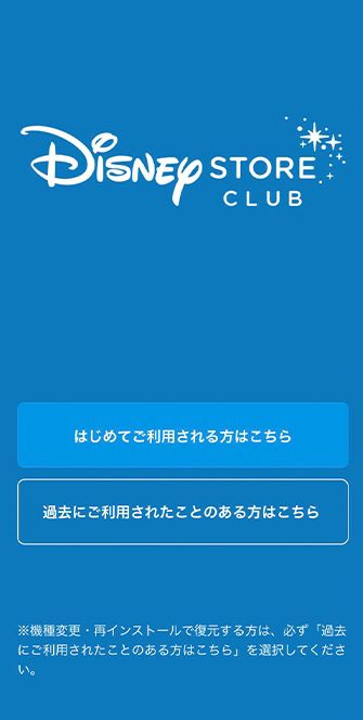 ※すでに会員になっている方(MyDisney (マイディズニー)アカウントでログイン済の方のみ)、アンインストールした方は「過去にご利用されたことのある方はこちら」からはじめてください。「過去にご利用されたことのある方はこちら」からアプリをはじめて、MyDisney(マイディズニー) アカウントでログインすると、ディズニーストアクラブの会員データが復元します。