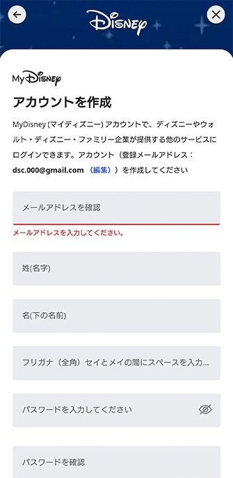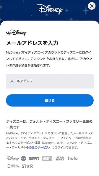 ※MyDisney アカウントをお持ちでない方はメールアドレスを入力し、アカウントを作成していただく必要があります。