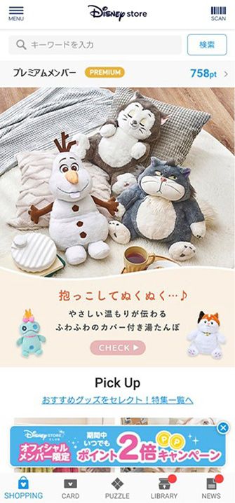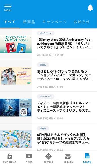 新商品やキャンペーンなどディズニーストアの情報をチェックしたり、キーワードで販売中のグッズ検索ができます。