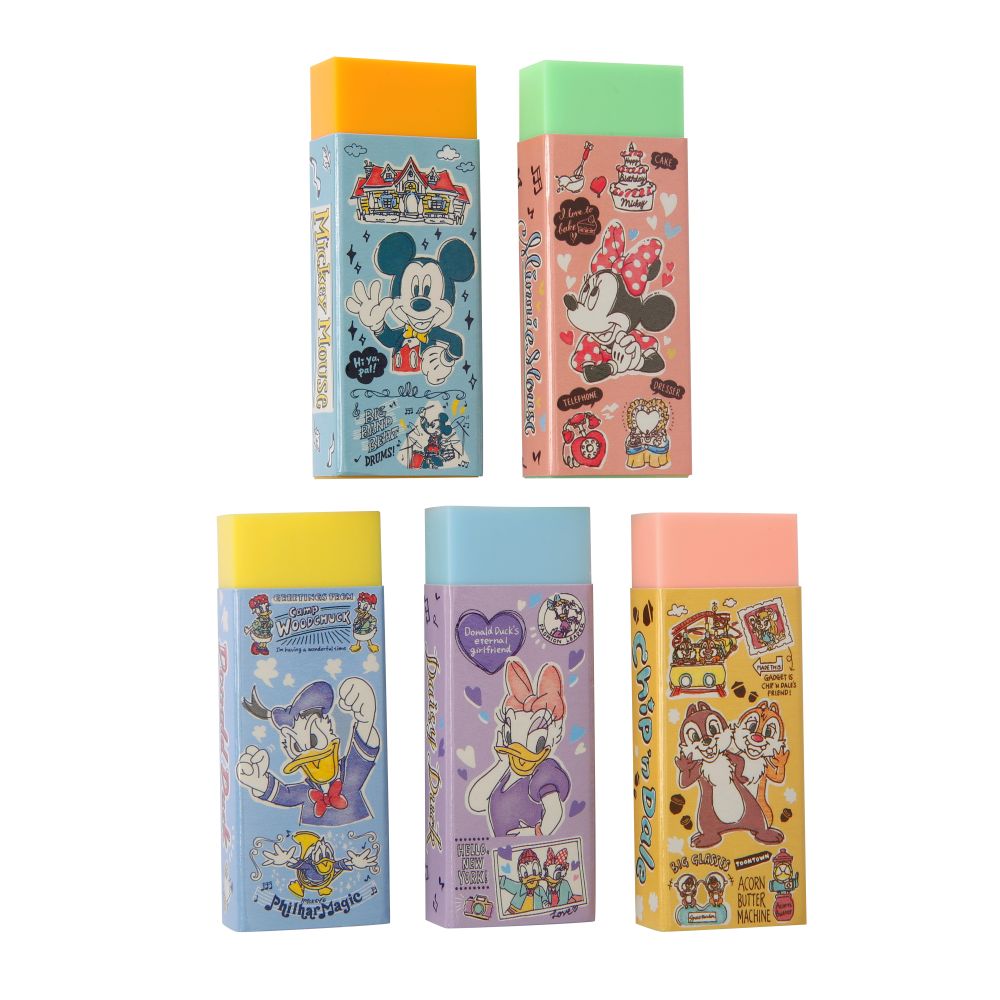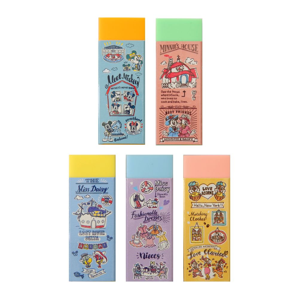 ミッキー、ミニー、ドナルド、デイジー、チップとデールにまつわるアトラクションやショーなどがそれぞれ細かくデザインされている消しゴム5個セット。