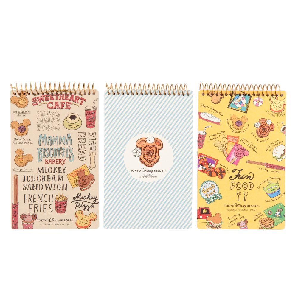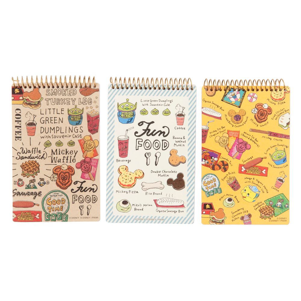 パークで人気のフードがデザインされたメモの3冊セット。同じデザインのシャープペンシルや消しゴムも販売中。セットで使うのも楽しそう。