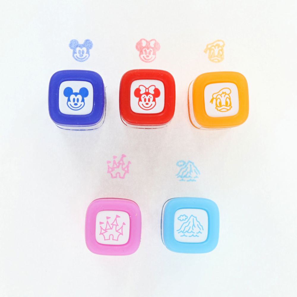 ミッキー、ミニー、ドナルド、シンデレラ城、プロメテウス火山、それぞれをモチーフにデザインした、全5種類のスタンプ〈フリクション〉です。