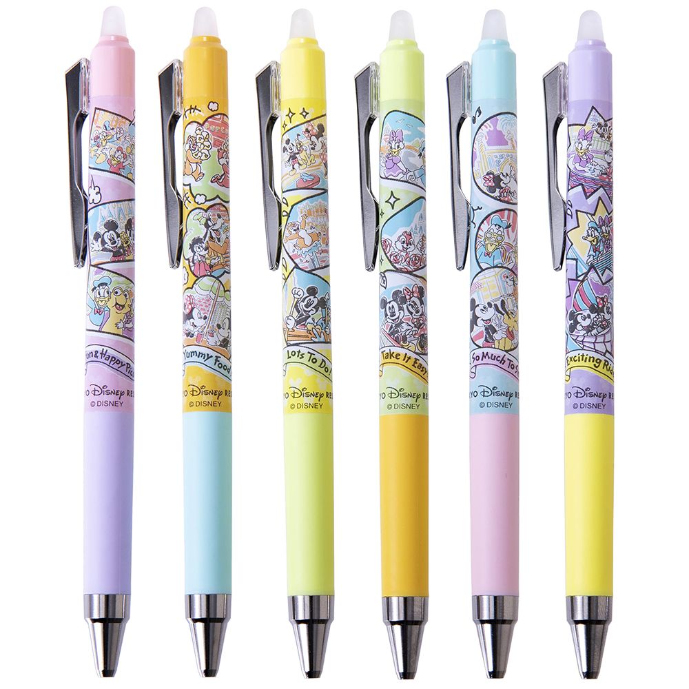ディズニーキャラクターがパークを元気いっぱい楽しむデザインのボールペン〈フリクション〉6本セットです。