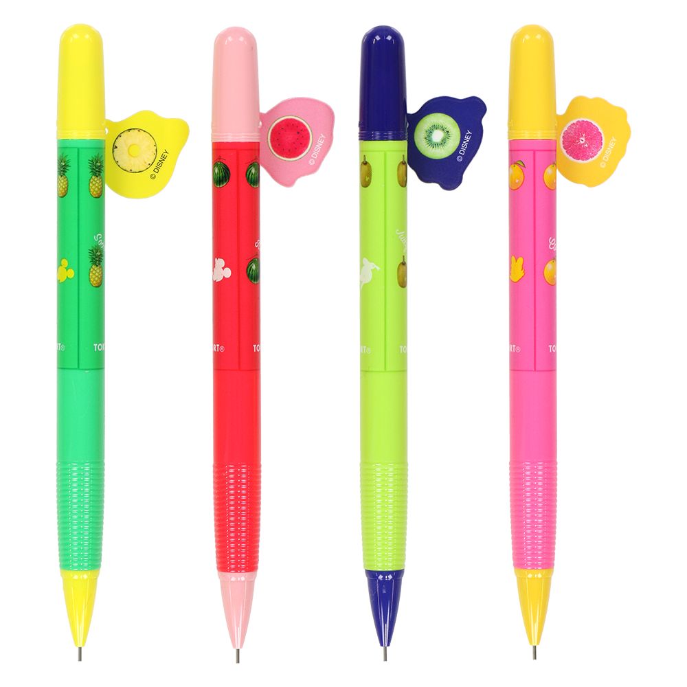 トロピカルなフルーツと、フルーツをモチーフにしたコスチューム姿のミッキーたちがデザインされたシャープペンシル4本セット。