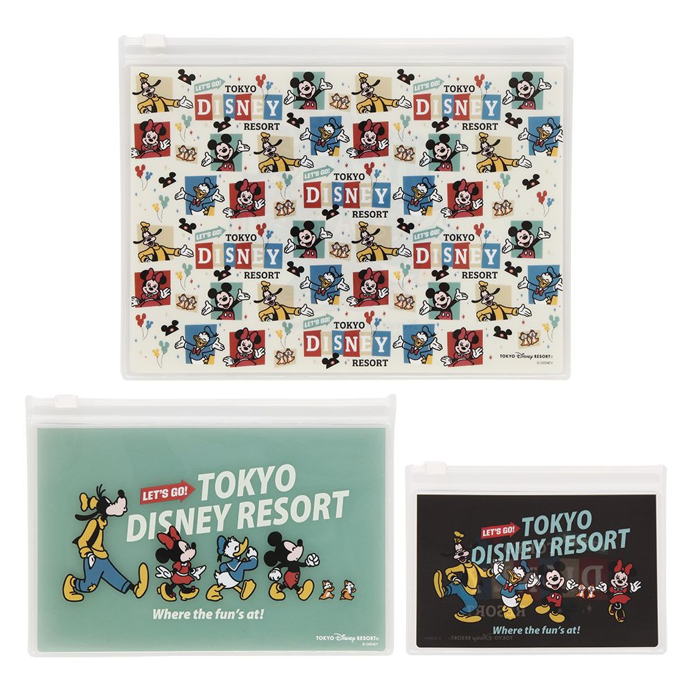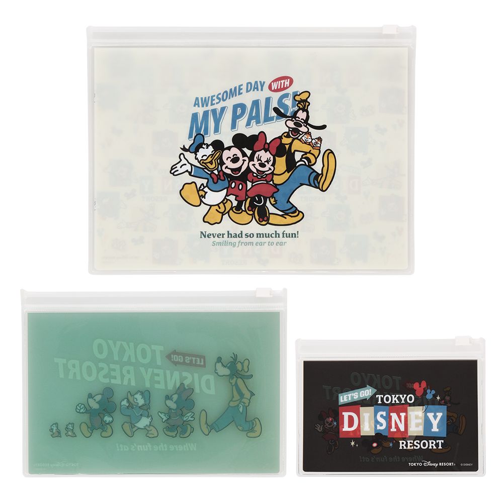 はじける笑顔と元気いっぱいのミッキーたちがデザインされたスライドジップケース。