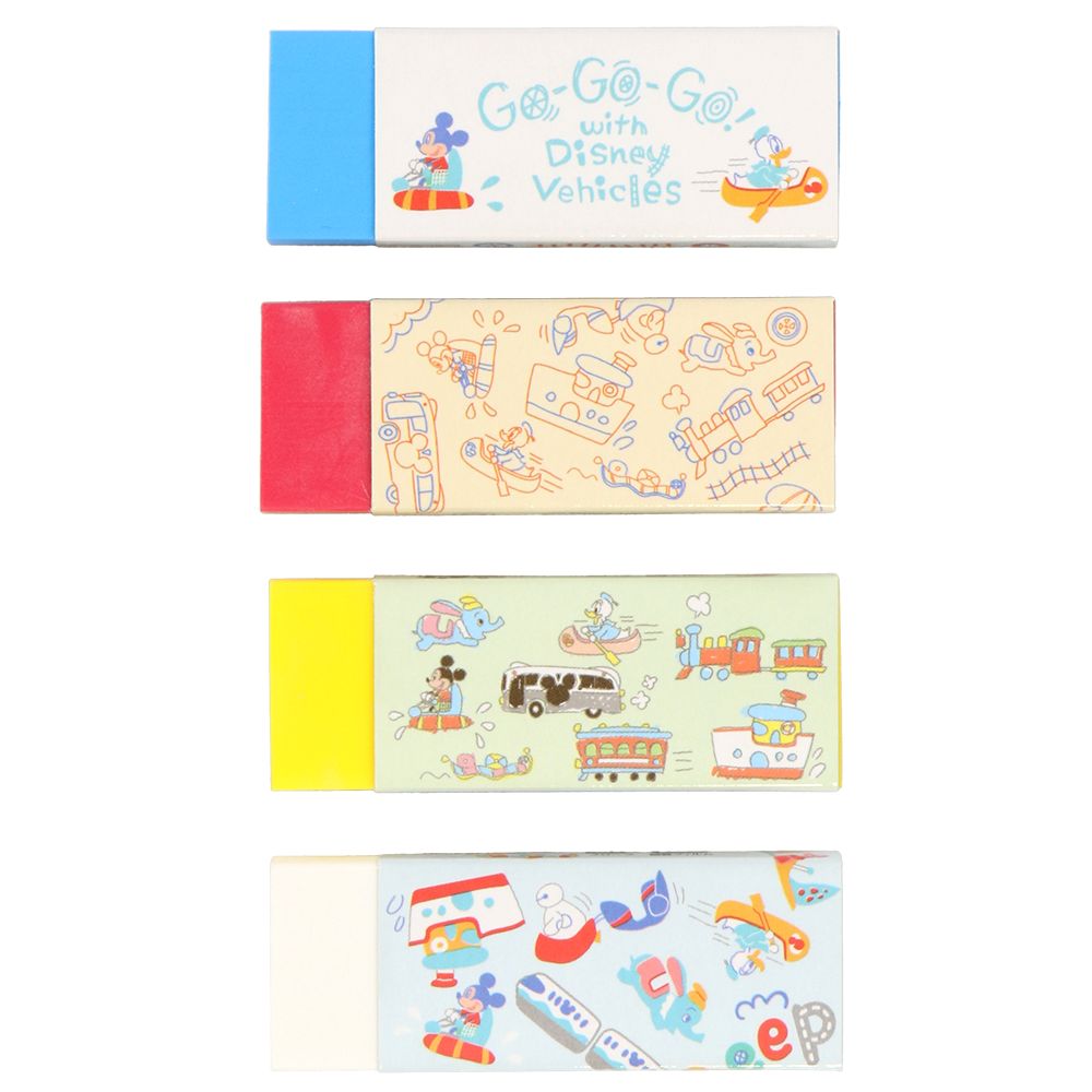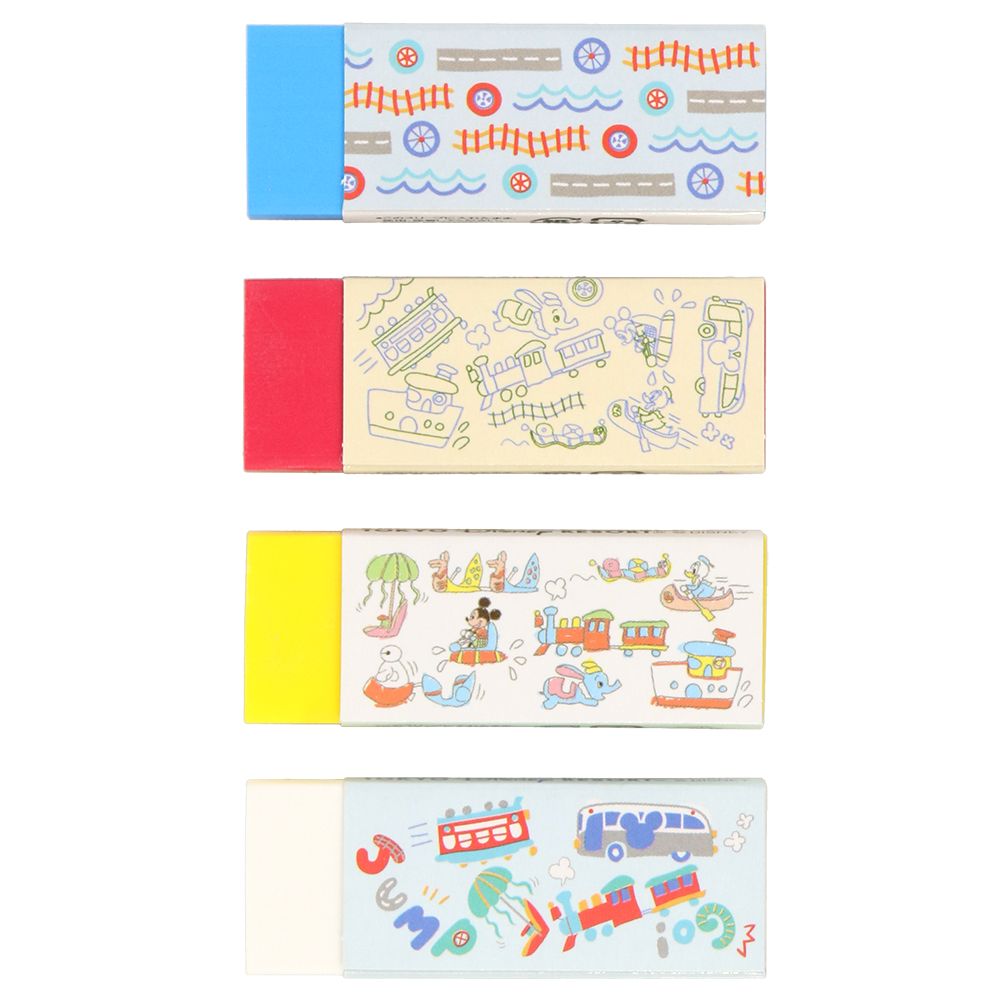 ミッキーやドナルドが乗り物に乗っている様子などが描かれた消しゴム〈Ain〉の4個セット。