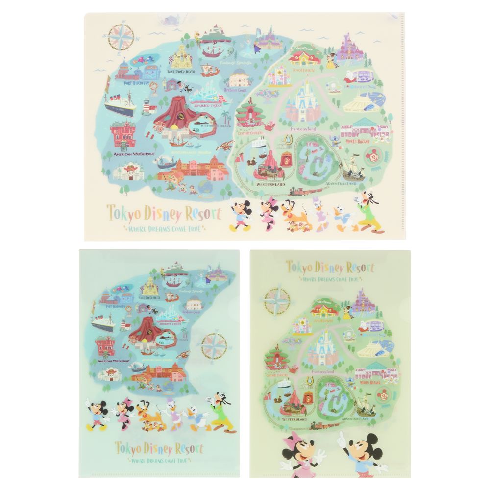 ミッキーたちが楽しそうに巡っているパークのマップやアイコンをモチーフにしたクリアホルダー3枚セット。