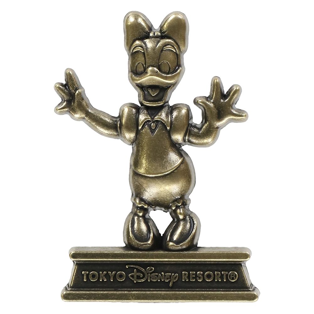 東京ディズニーランドの入口に続くデッキで、ゲストを迎えるキャラクターのブロンズ像をモチーフにしたピンバッジです。