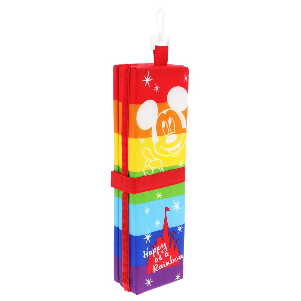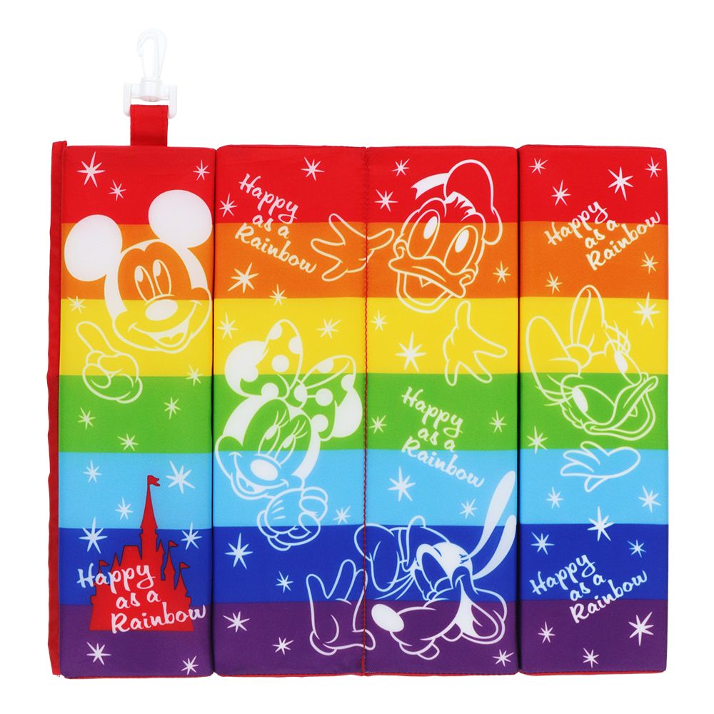 ミッキーと仲間たちや、シンデレラ城のシルエット、Happy as a Rainbowの文字などがデザインされています。