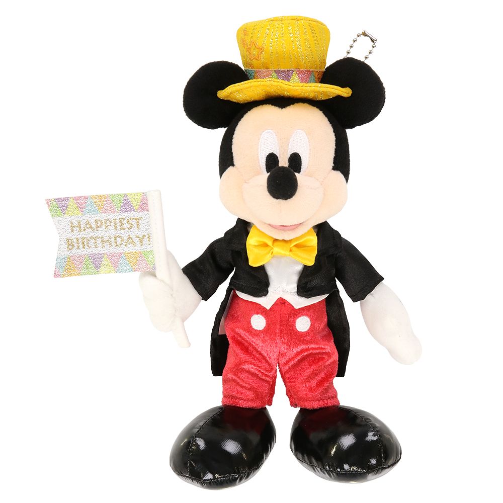ミッキーがHAPPIEST BIRTHDAY!と書かれたフラッグを持っている、ぬいぐるみバッジです。