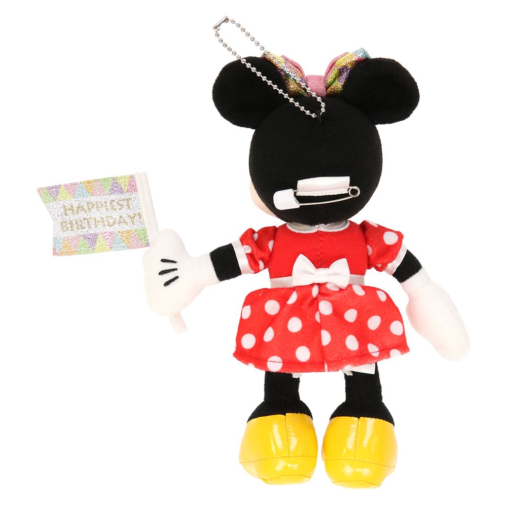 ミニーがHAPPIEST BIRTHDAY!と書かれたフラッグを持っている、ぬいぐるみバッジです。