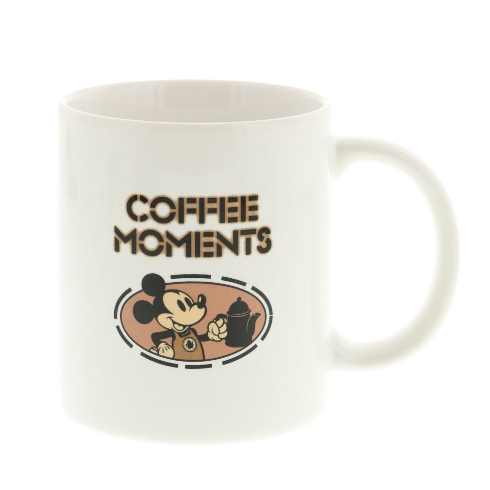 エプロンをつけたミッキーが描かれたマグカップ。