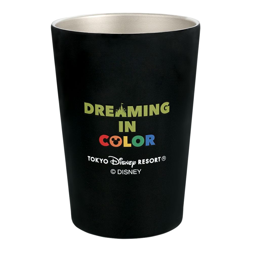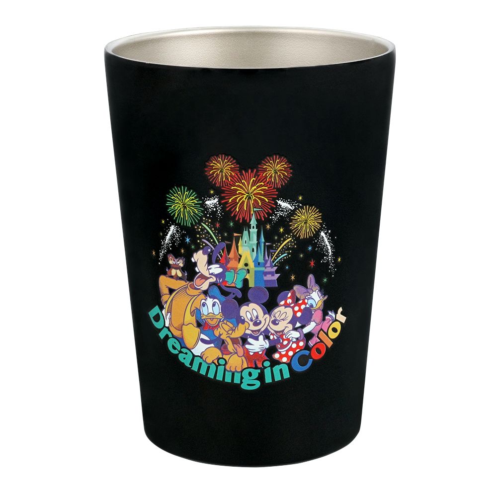 東京ディズニーランドのシンデレラ城と花火、ミッキーマウスと仲間たちが描かれているタンブラー。