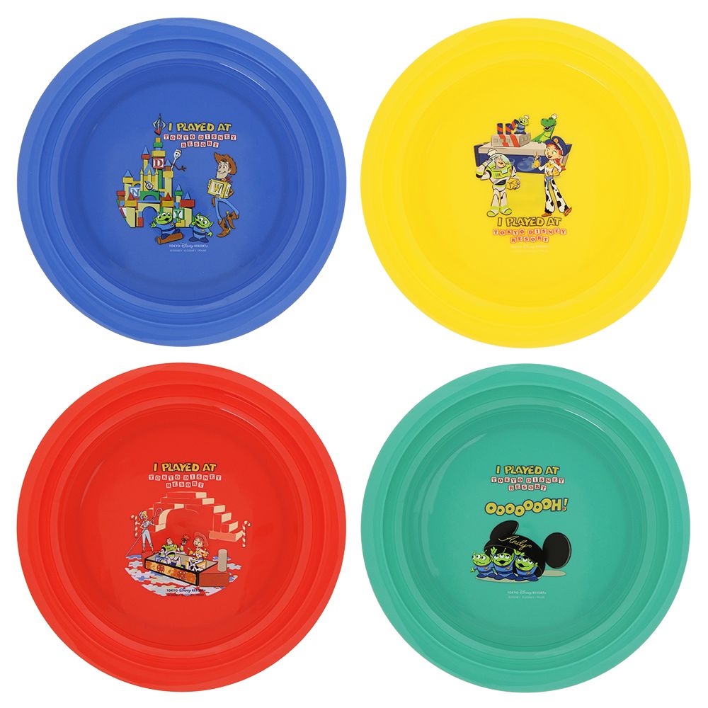 映画『トイ・ストーリー』シリーズのウッディやバズ、ジュディ、リトルグリーンメンたちがデザインされた、カラフルなプレートの4枚セット。