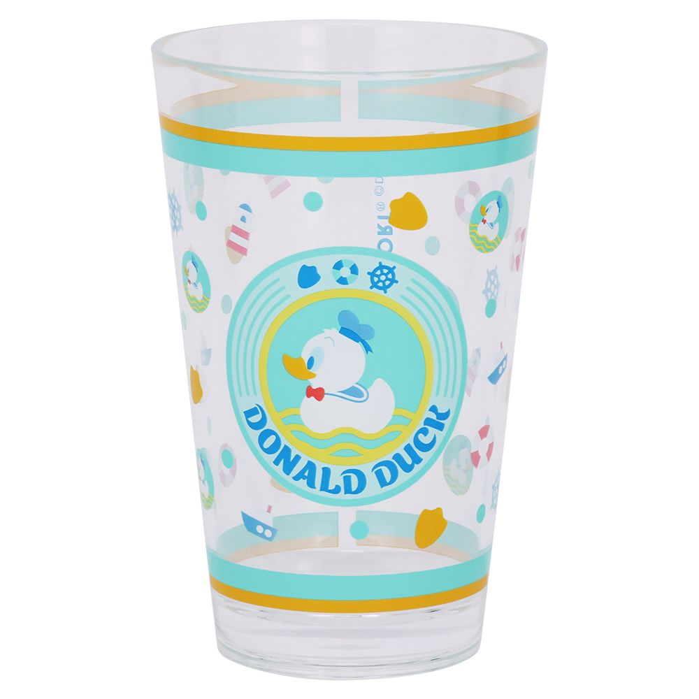 ぷかぷか浮いているドナルドがデザインされたタンブラー。