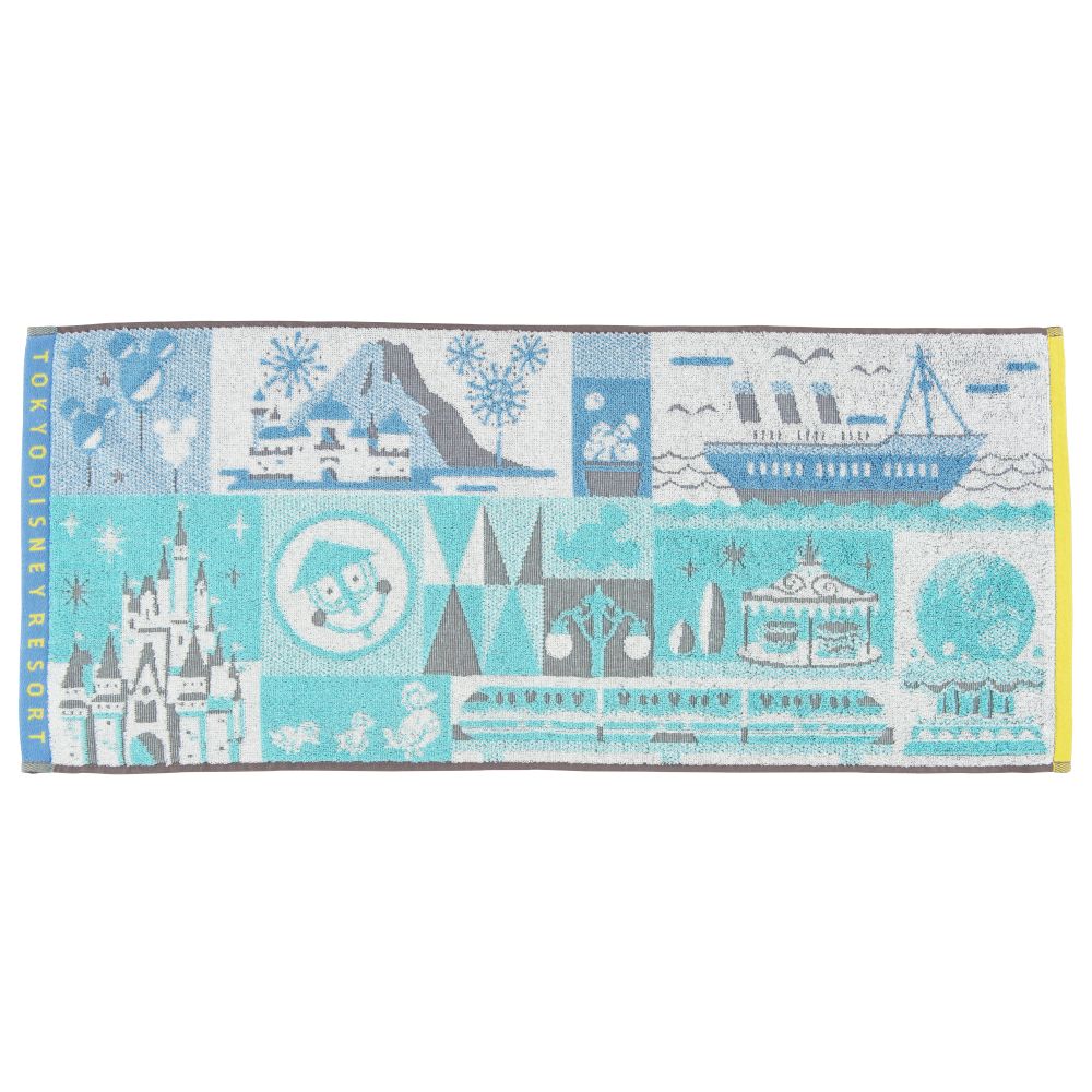 東京ディズニーリゾートの風景やアトラクションなどのアイコンがデザインされた、フェイスタオル。