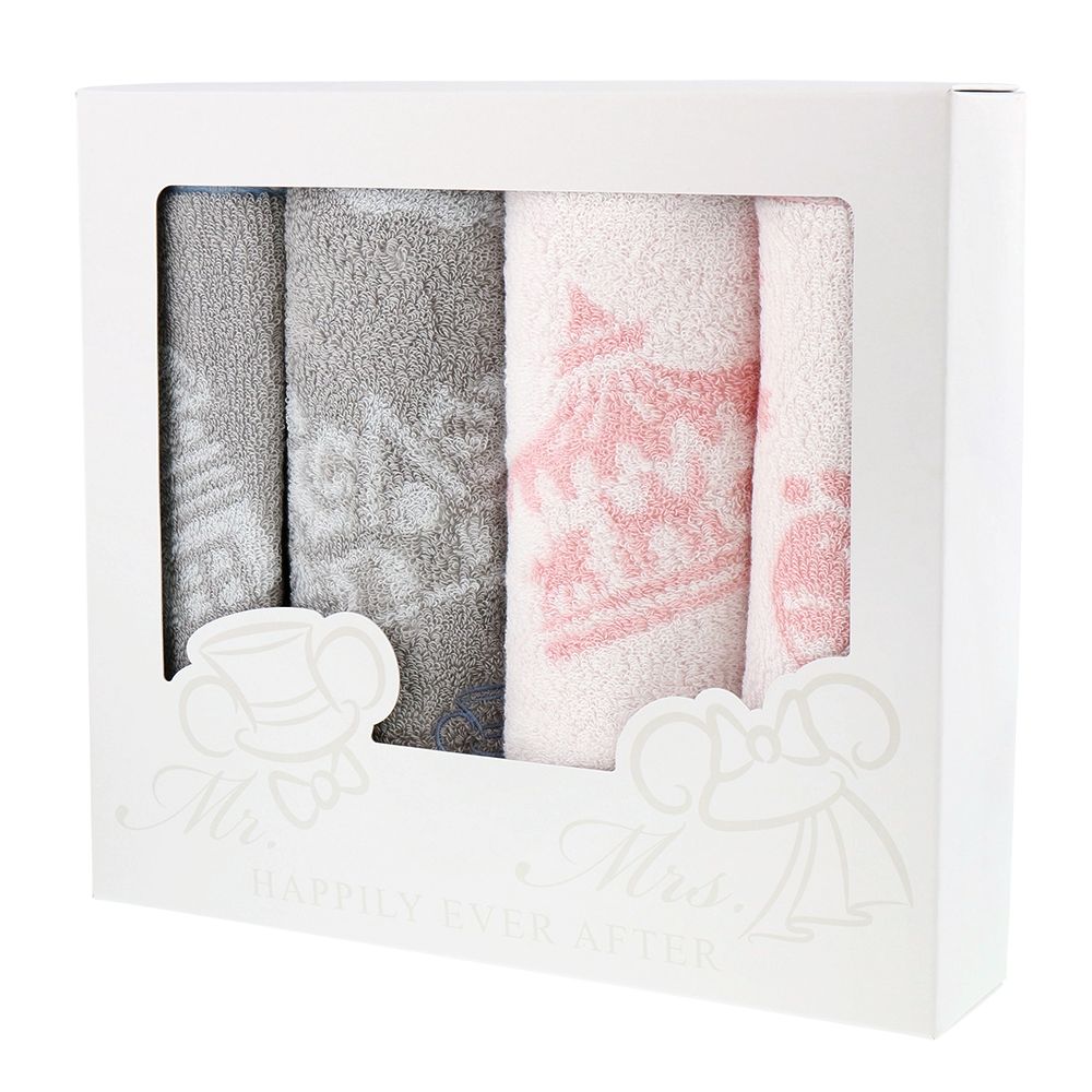 グレーの方にはミッキーをイメージした刺繍、ピンクの方にはミニーをイメージした刺繍が入った、ミニタオルとフェイスタオルがそれぞれ2枚ずつセットになっています。淡いカラーがやさしい雰囲気で、使うたびに癒やされそう♪