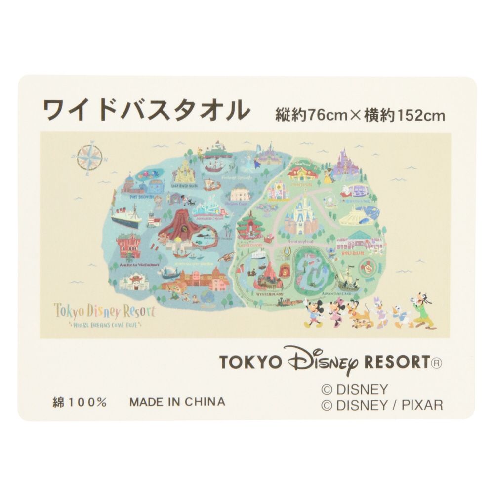 ミッキーたちが楽しそうに巡っているパークのマップやアイコンをモチーフにしたワイドバスタオル。