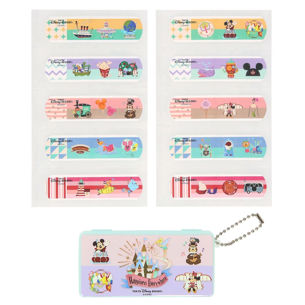 カラフルなパークのアイコンがデザインされたばんそうこうとケースのセット。