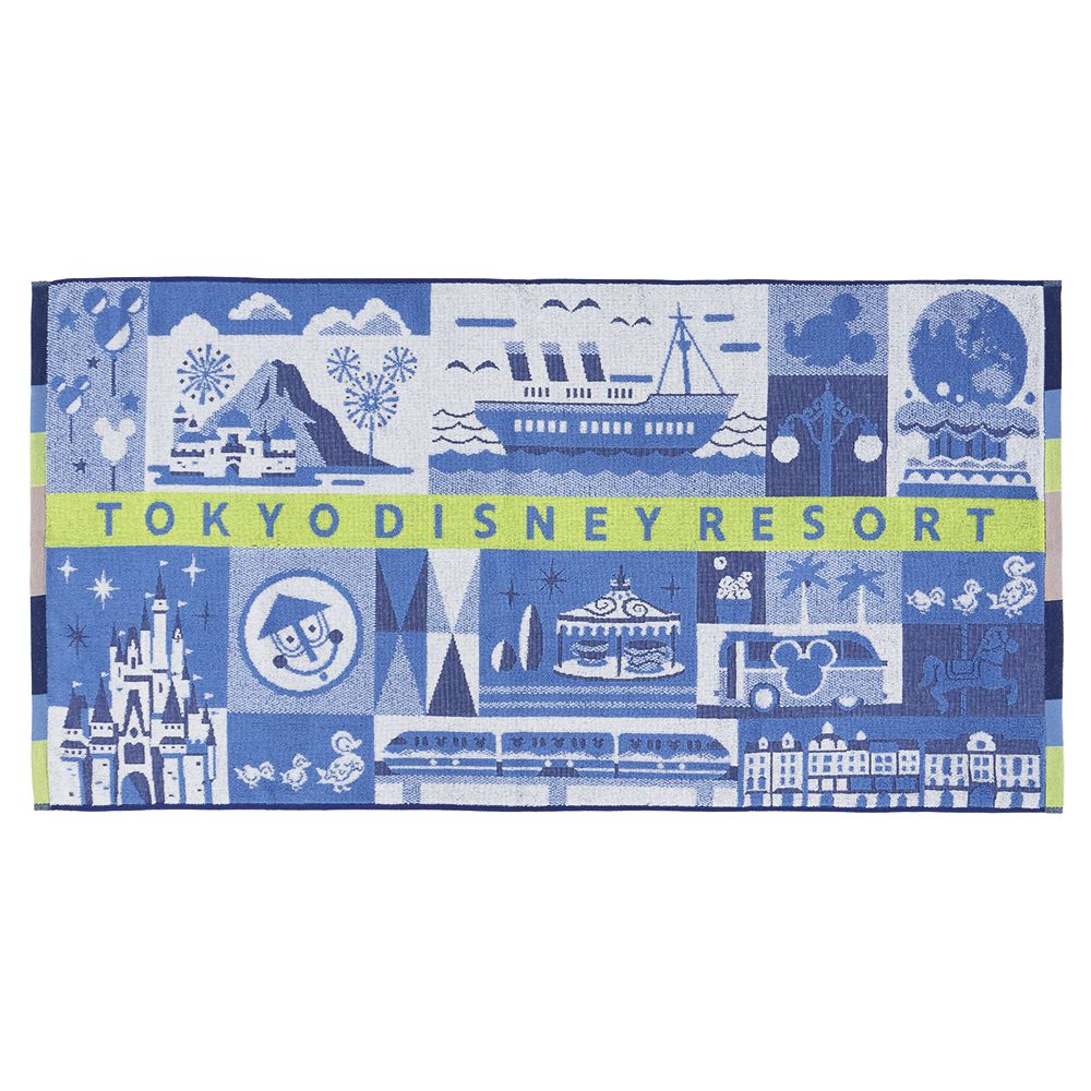 東京ディズニーリゾートのアイコンや、アトラクションなどが描かれたデザインが印象的なバスタオル。