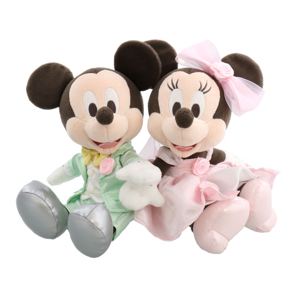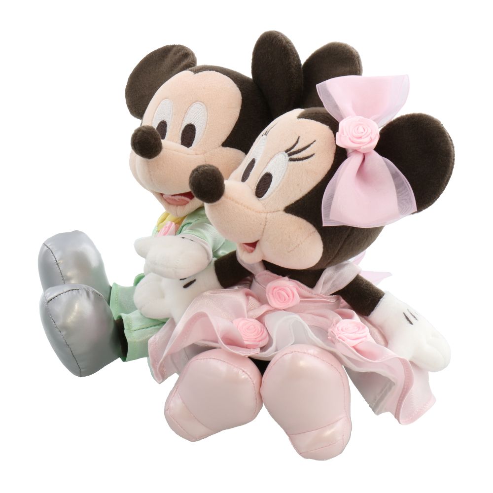 ウェディングシーンを思わせるコスチュームを着用した、ミッキーとミニーがセットになったぬいぐるみ。