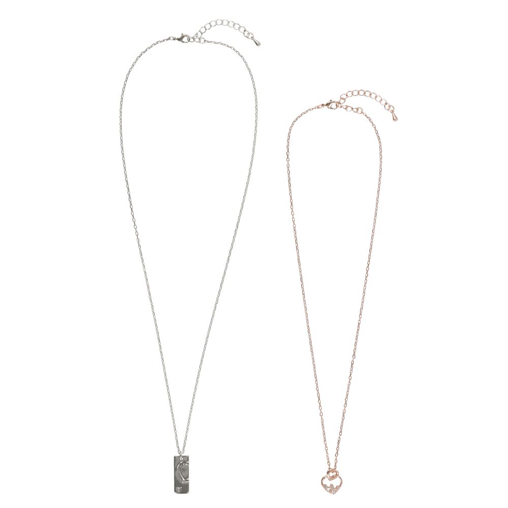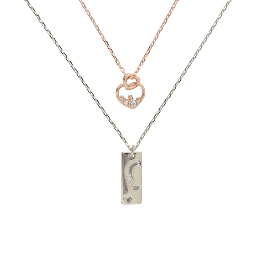 ハート形のネックレスとスクエア形のネックレス、それぞれにミッキーシェイプがデザインされているのがポイント!
