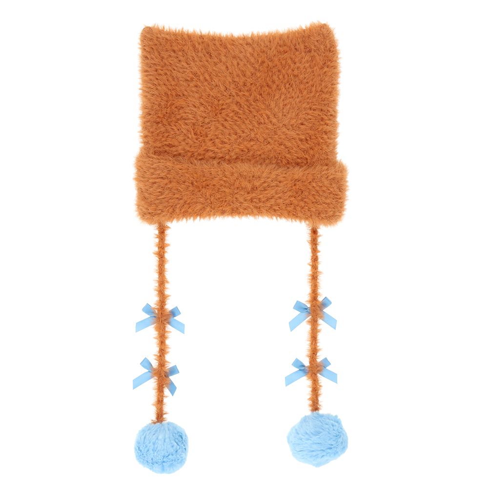 頭にかぶると、ネコの耳のように見えるデザインが目を惹きます。ブルーのリボンとボンボンも印象的♪