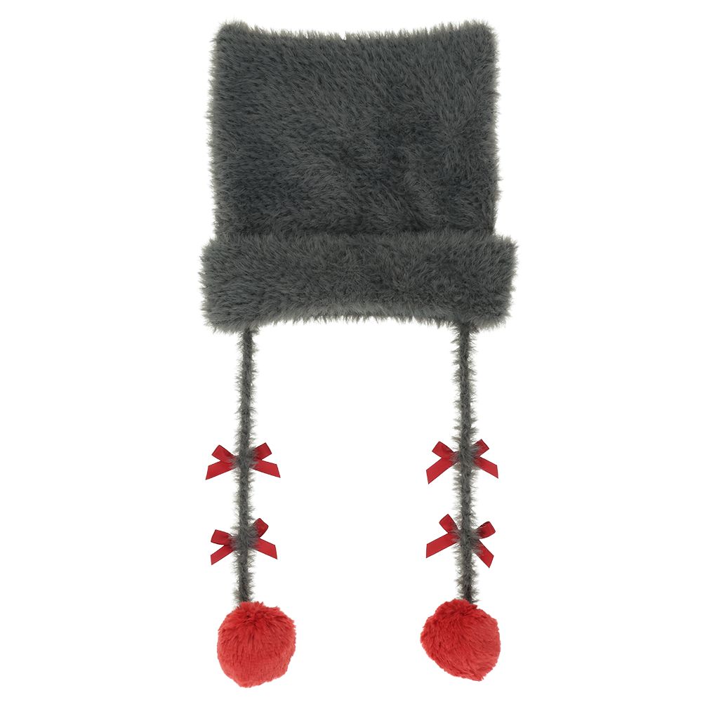 頭にかぶると、ネコの耳のように見えるデザインが目を惹きます。レッドのリボンとボンボンも印象的♪