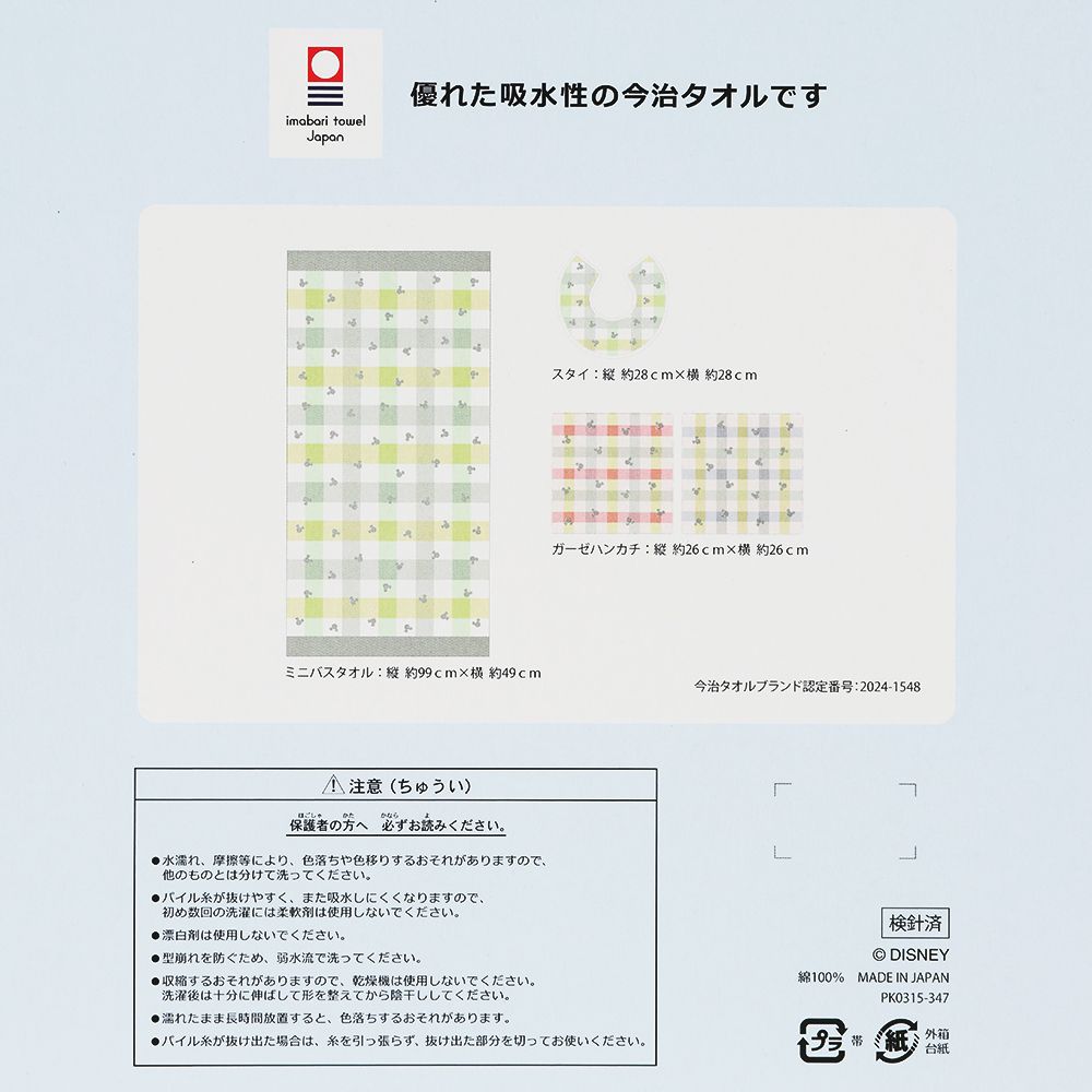 ミニバスタオル、スタイ、ガーゼハンカチ2枚が入ったセットです。ミニバスタオルはお風呂の時間に大活躍。スタイはスナップボタンが付いているので、お子さまの成長に合わせて調整できます。ガーゼハンカチは2枚セットなので洗い替えに便利。
