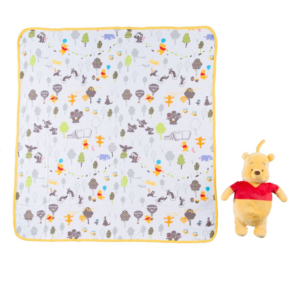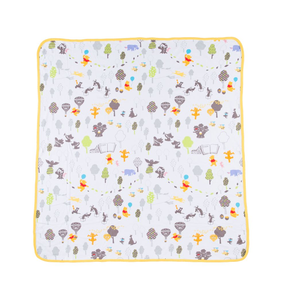 プーをはじめとするさまざまなキャラクターのシルエットがデザインされたベビーブランケットです。