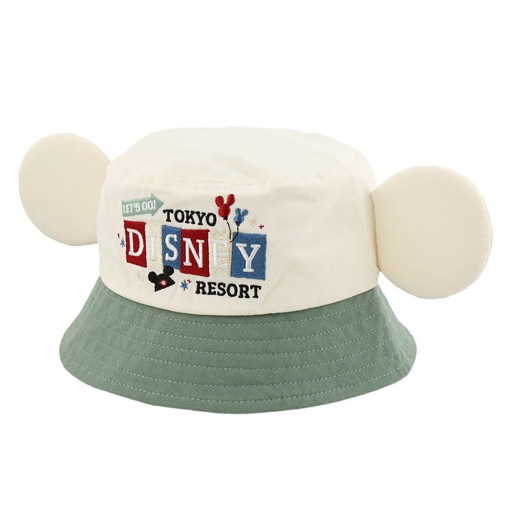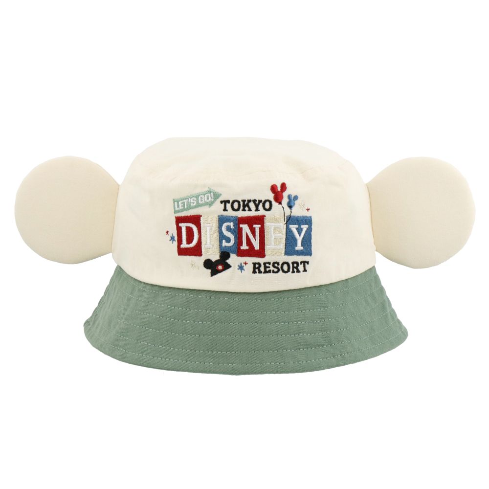 はじける笑顔と元気いっぱいのミッキーたちがデザインされた耳付きのベビー帽子です。