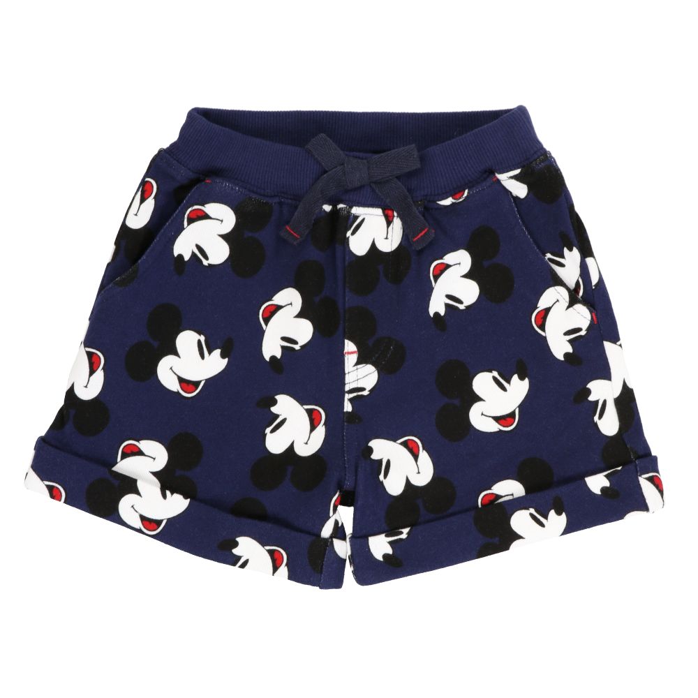 落ち着いたネイビーの生地にプリントされた、ミッキーの総柄が映えるベビーパンツ。