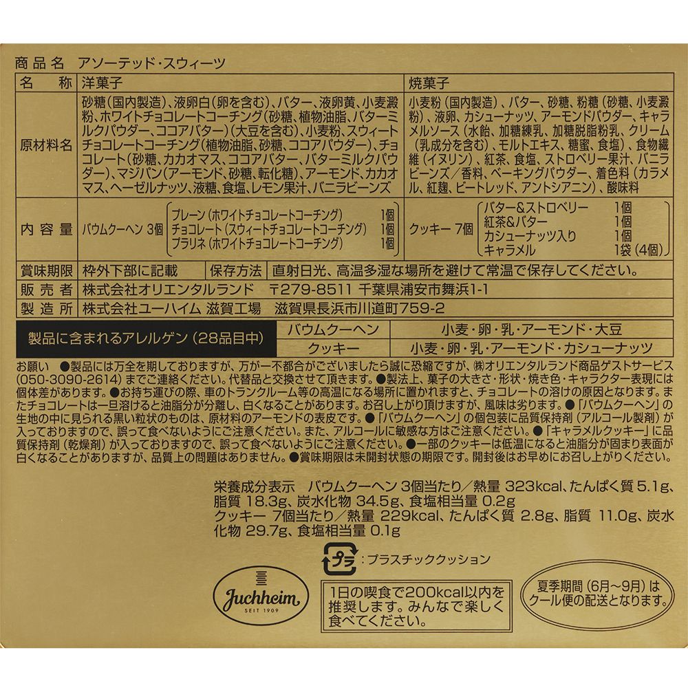 プレーン、チョコレート、プラリネの3種類の味のバウムクーヘンと、バター&ストロベリークッキー、紅茶&バタークッキー、カシューナッツ入りクッキー、キャラメルクッキーとたくさん種類が入っているので、どれから食べるか迷ってしまいそうです♪