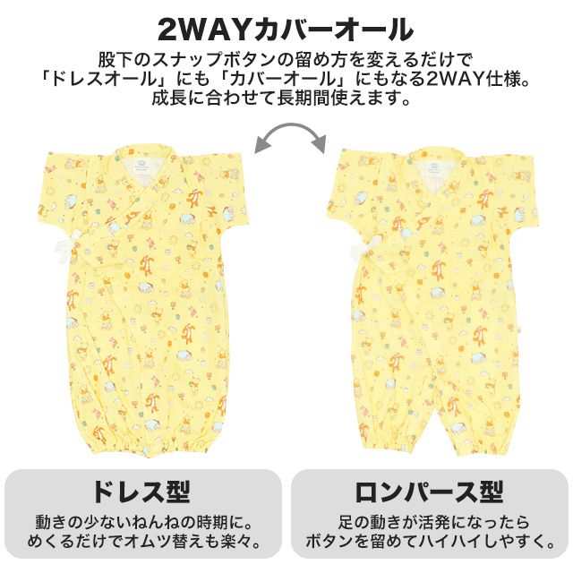 股下のスナップボタンの留め方を変えることで、「ドレスオール」にも「カバーオール」にもなり、成長に合わせて長く使えます♪