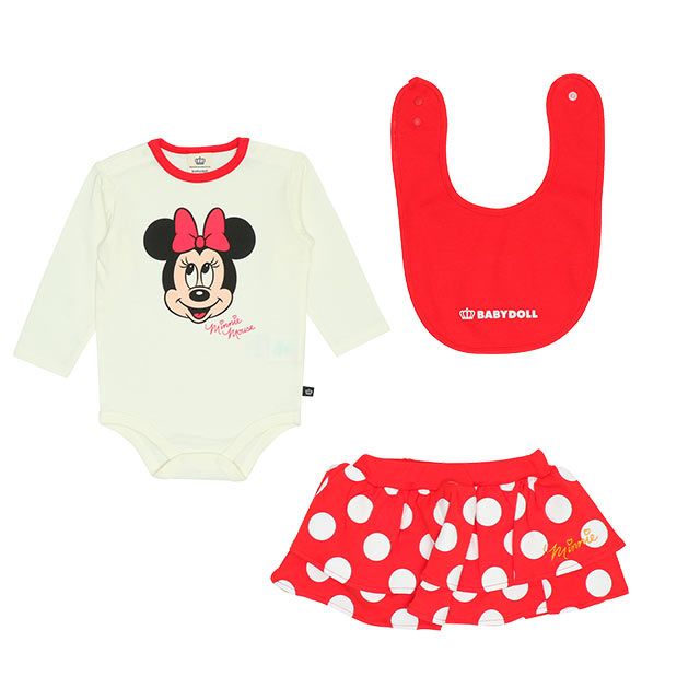 【ベビードール】ミニー ギフトBOX付き 3点ギフトセット 9139B 【DY】 / 70-80cm ベビーサイズ 赤ちゃん 出産祝い 贈り物 プレゼント ベビー服 長袖 ボディースーツ スタイ ボトムス スカート コーデセット お得