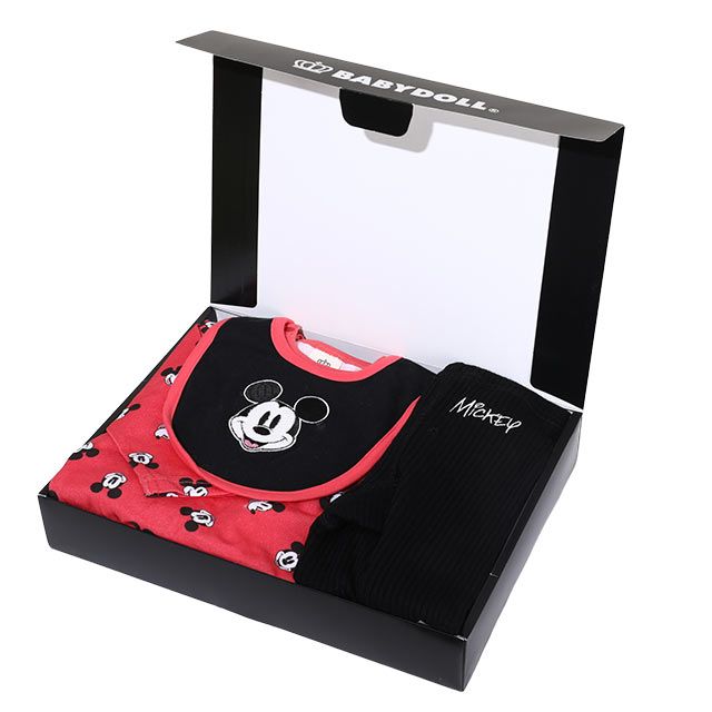 【ベビードール】ミッキー ギフトBOX付き 長袖 3点ギフトセット 0140B 【DY】 / 70-80cm ベビーサイズ 赤ちゃん 出産祝い 贈り物 プレゼント コーデセット つなぎ ボディースーツ パンツ スタイ