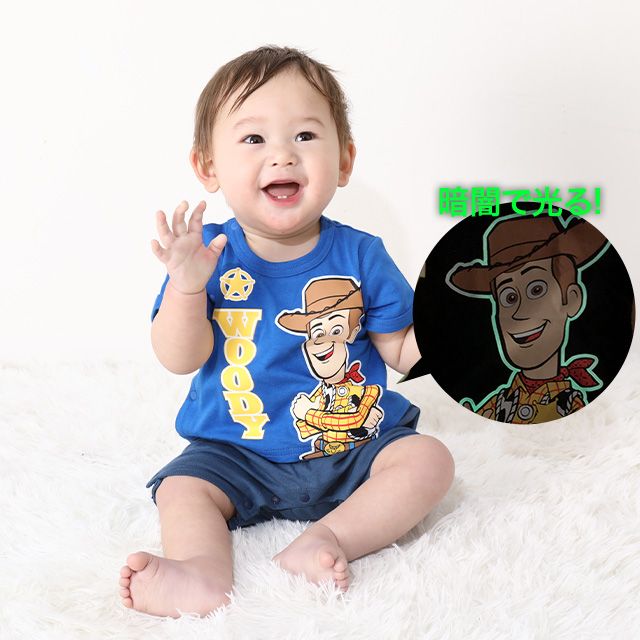 【ベビードール】ウッディ 蓄光キャラクターロンパース 0403B / トイ・ストーリー 80cm ベビーサイズ 赤ちゃん ベビー服 リンクコーデ ペアルック 親子コーデ つなぎ 半袖 ボディ肌着 暗いところで光る 綿100% 天竺素材