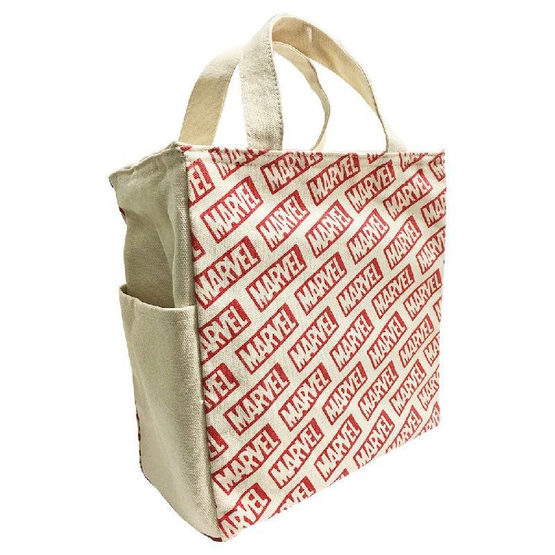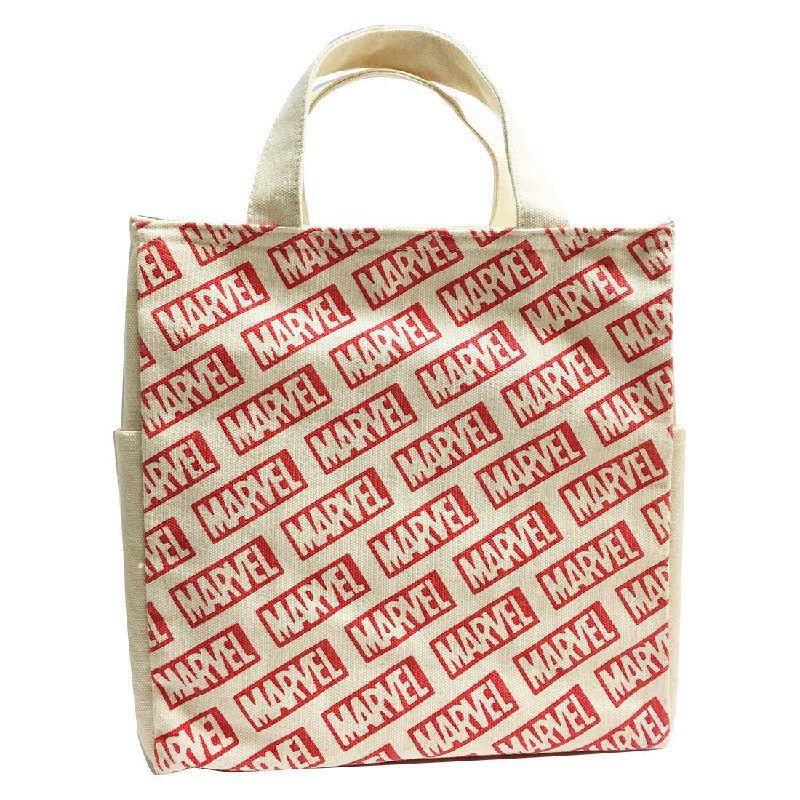 MARVEL(マーベル) ロゴ スクエア 保冷 ランチバッグ 。保冷機能を高めるために内側にアルミの蒸着フィルムと、片面に保冷剤が入れられるメッシュのポケットが付いています。(保冷剤はついていません)通勤通学のお弁当・ペットボトル入れバッグはもちろん、ピクニックなどの行楽のバッグにもお勧めです。500mlのペットボトルなら3本入れられます。