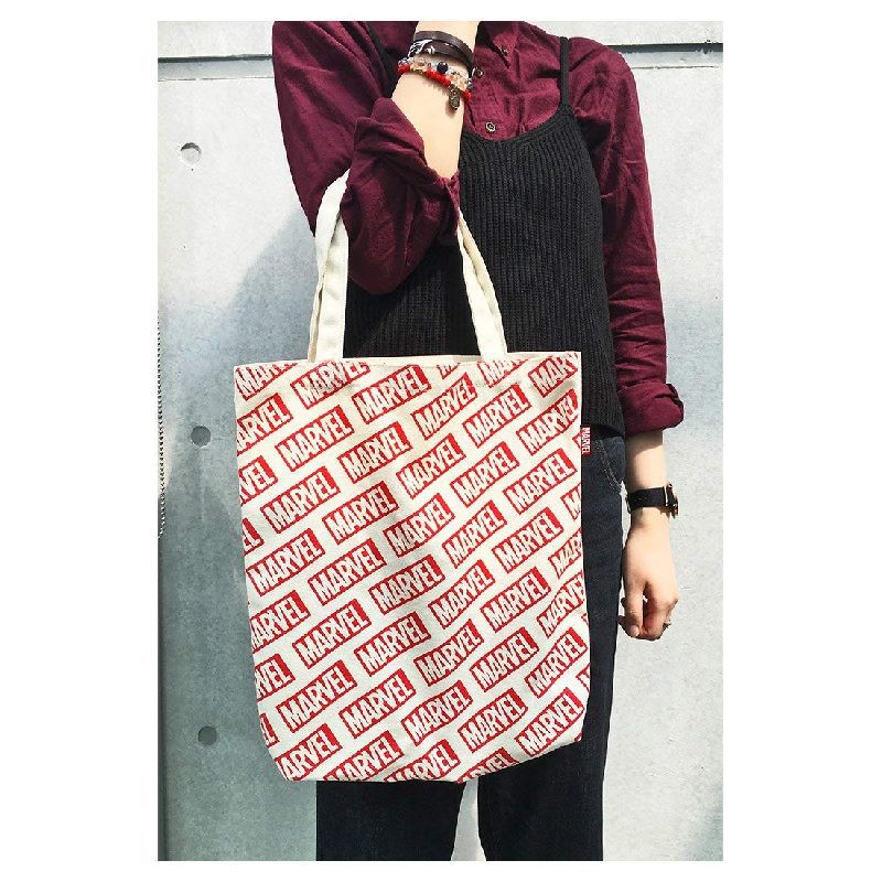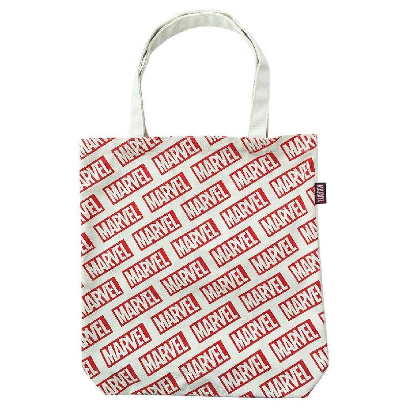 MARVELロゴの肩掛けコットントートバッグ。くたっとしたコットンの風合いで、柄によって持ち手の色が違うのもオシャレなポイント。内ポケットが付いているのでスマホや定期もサッと取り出せて、A4サイズがたっぷり入る大容量なので通勤や通学のバッグにもオススメです。
