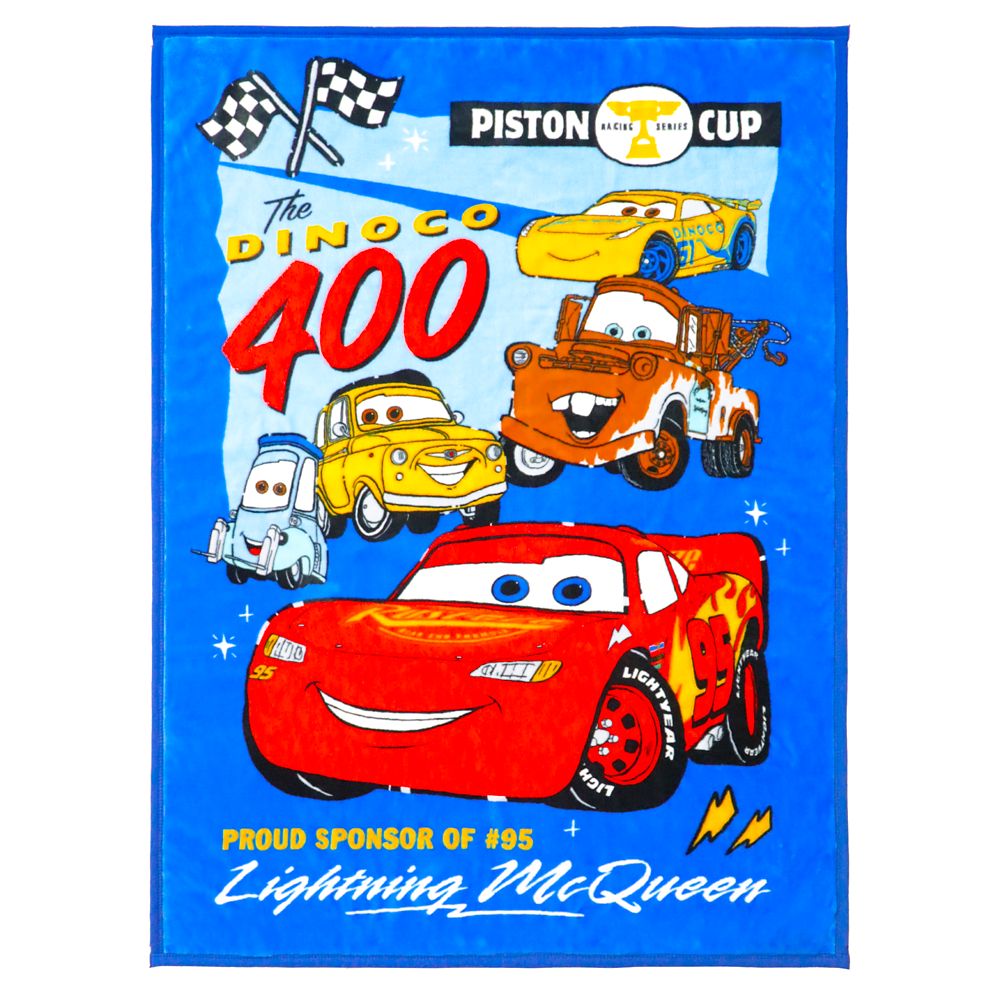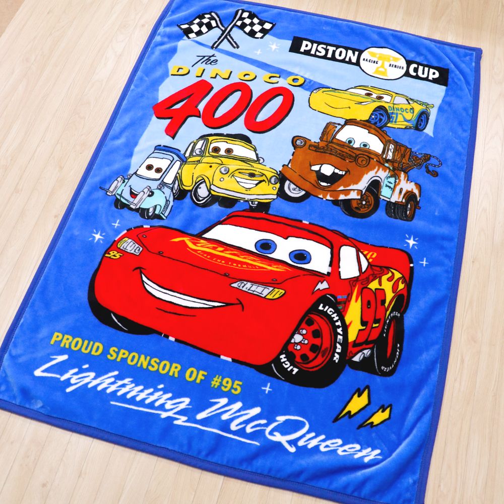 ☆ライトニング・マックイーン、メーター、ルイジ&グイドが描かれた元気なデザインのニューマイヤー毛布。鮮やかなブルーがクール!