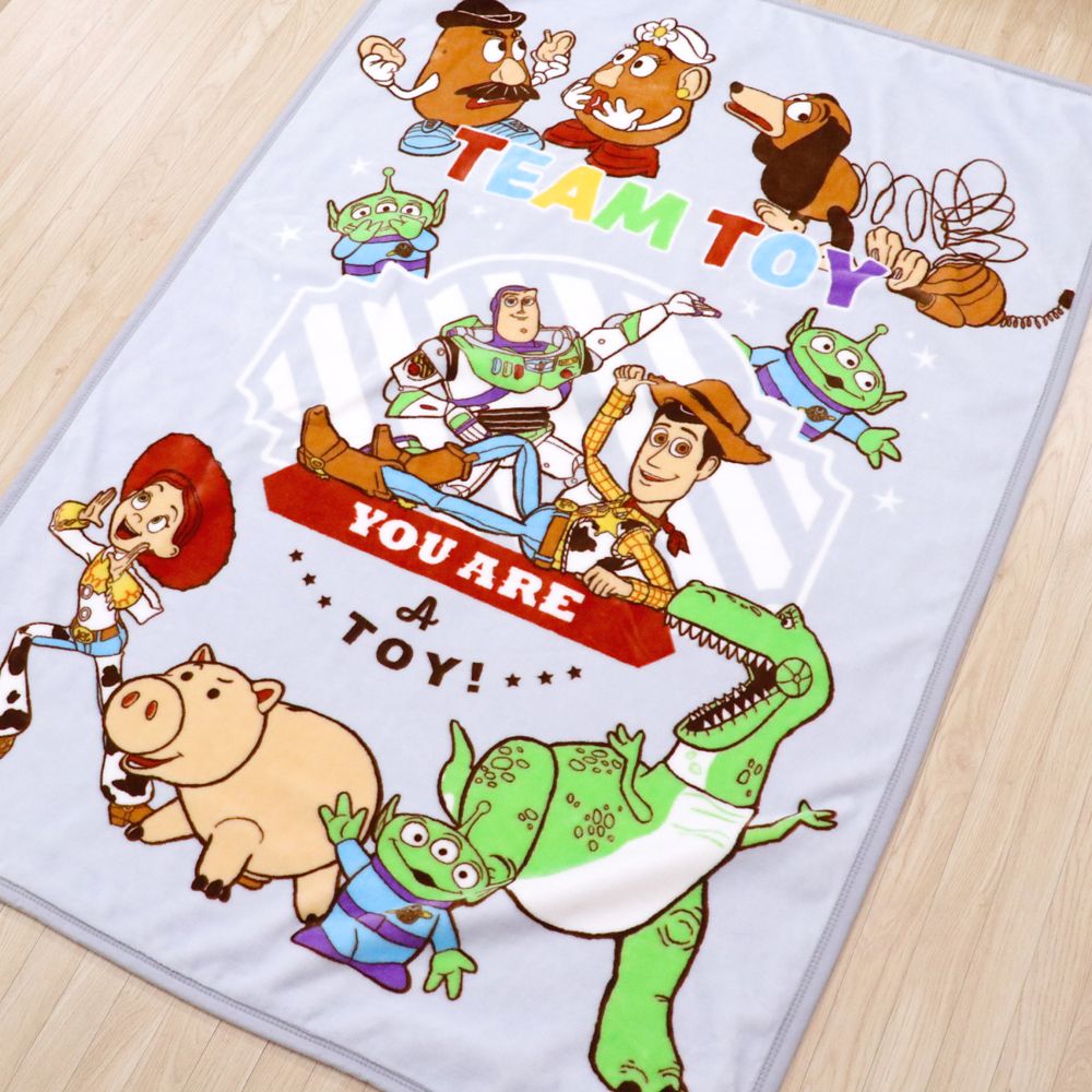 ☆ウッディ、バズ・ライトイヤー、ジェシー、エイリアン、ミスター・ポテトヘッド、ミセス・ポテトヘッド、レックス、ハム、スリンキー・ドッグ、『トイ・ストーリ』の仲間たちが描かれた、グレーベースがクールなデザインのニューマイヤー毛布。