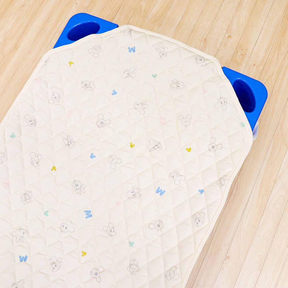 ☆コットに引っ掛けて簡単装着できるコットカバー。保育園や幼稚園でのお昼寝タイムが楽しくなる、ミッキーとミニーのかわいいフェイスが描かれたキュートなデザイン。