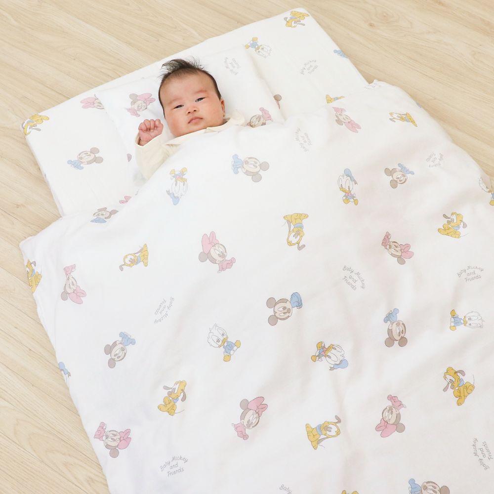 ☆掛中布団は、再生綿(わた)を一切使用していない、軽くてあたたかい中空糸を使用しました。さらに大小様々なミッキーアイコンのキルティングをミッキーデザインのお布団だけに採用しました。