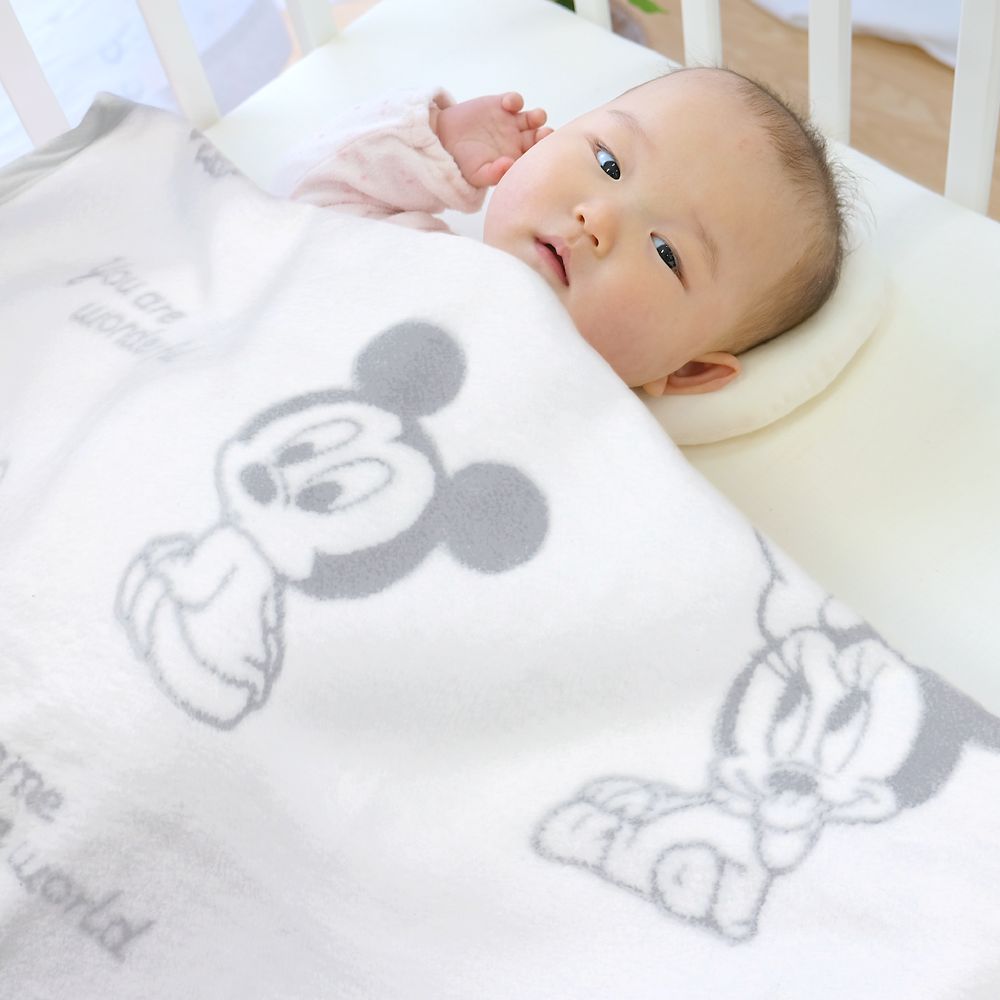 ☆『毛布のまち 泉大津市』からうまれた完全国内生産のコットン100%毛布です♪パパとママがキュンとするキュートなベビーミッキー・ベビーミニーのデザイン!