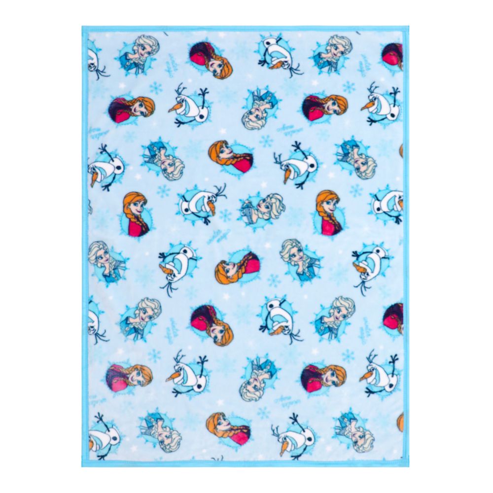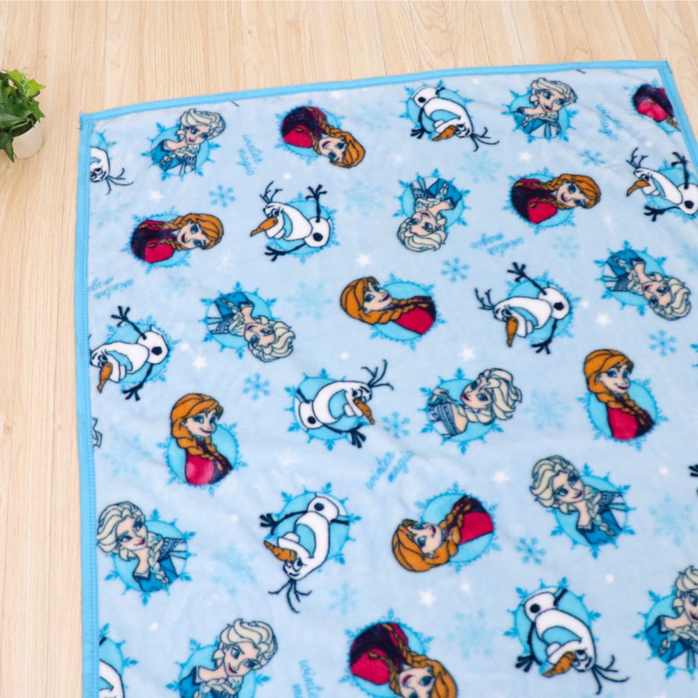 ☆アナ、エルサ、オラフが描かれた、ブルーを基調としたデザインのニューマイヤー毛布。