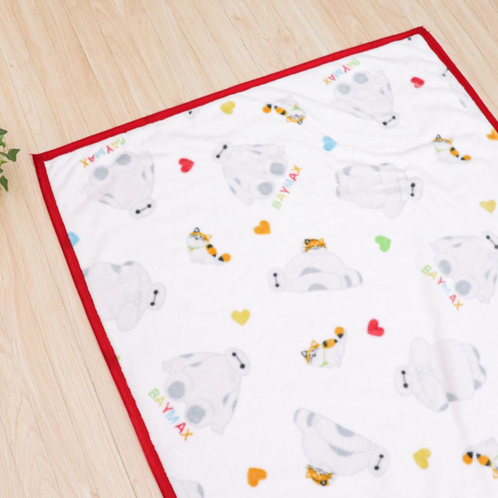 ☆ふわふわボディのベイマックスと気持ちよさそうにお昼寝しているモチが描かれたデザインのニューマイヤー毛布。