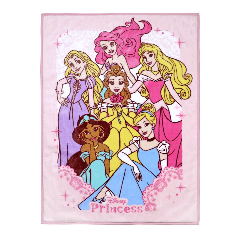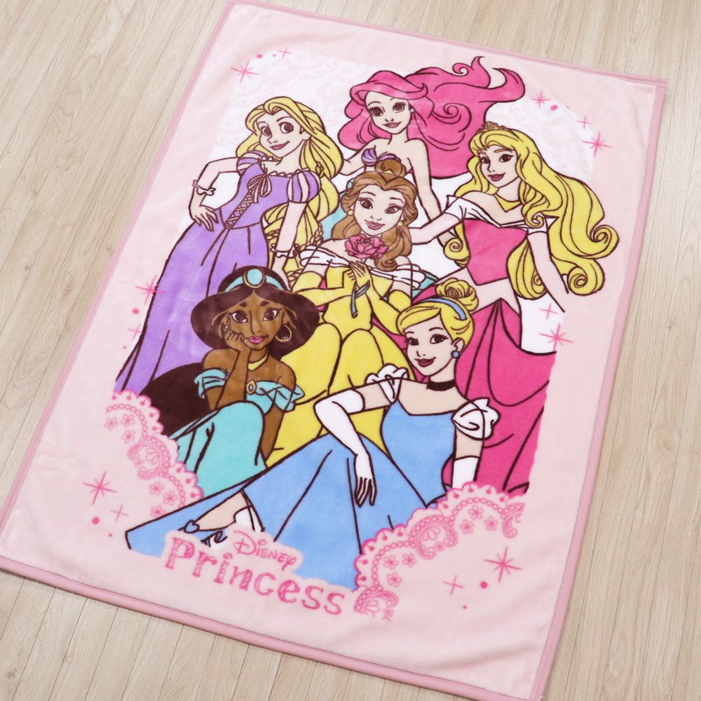 ☆ラプンツェル、アリエル、シンデレラ、ベル、オーロラ姫、ジャスミン、6人の「ディズニープリンセス」が描かれた華やかなデザインのニューマイヤー毛布。