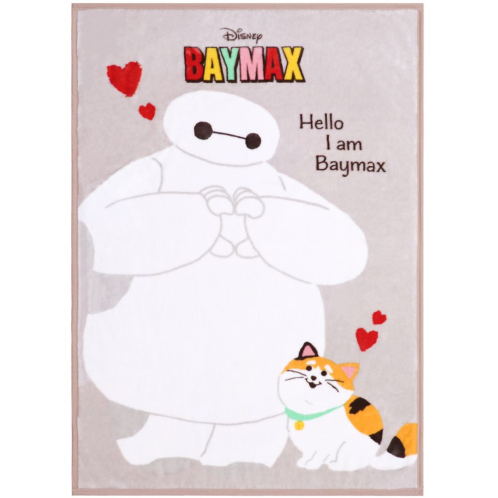 ☆ふわふわボディのベイマックスと気持ちよさそうにお昼寝しているモチが描かれたニューマイヤー毛布。