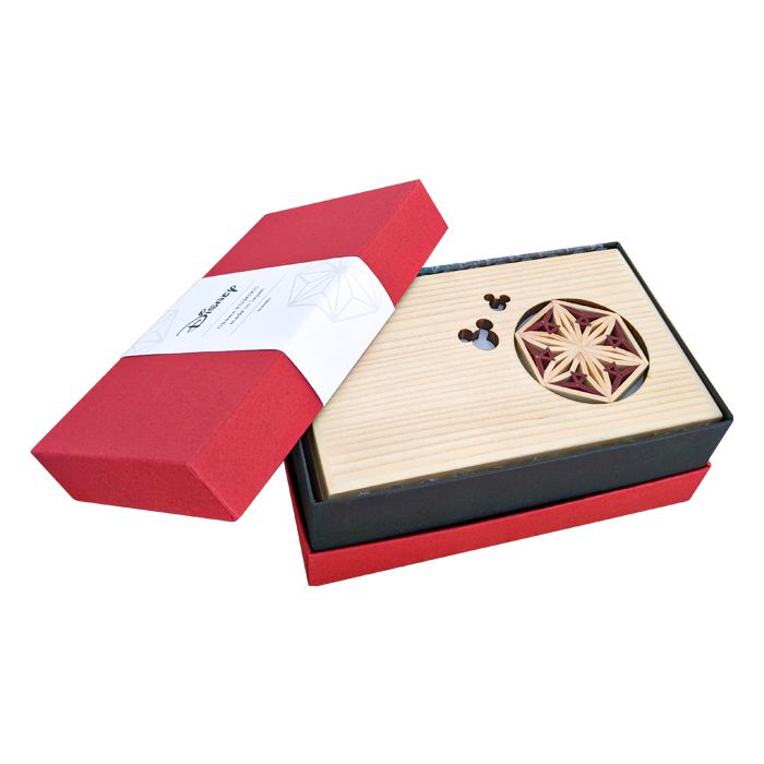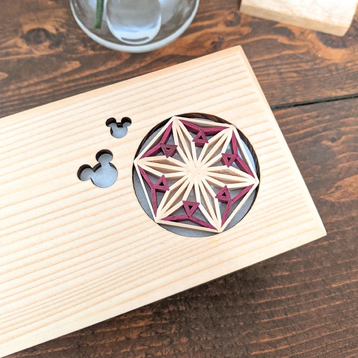 厚さ1.3~1.6㎜の繊細な組子細工「大川組子」と、ミツマルのデザインが美しい木製箱です。